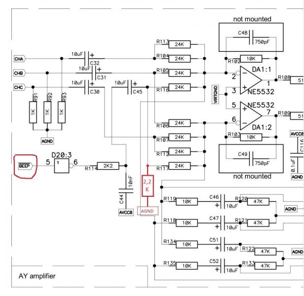 На новогодних праздниках попробую переменный резистор воткнуть, чтобы расставить все точки над Ё. А вообще и с 22кОм нормально, как на мой слух. Бипер стал на уровне громкости AY-8910. Естественно NEOGS, SounDrive, TSFM (это то, что сам слушал) играют гораздо тише AY-8910. По сути то вообще для ZX-Evolution нужен микшер. А это всего-лишь небольшой костыль, чтобы перепонки барабанные не лопались.