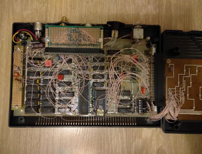 Слева кусок макетки, на нем доработки видео (коррекция ССИ на АГ1 и привязка к уровню черного), а зеленая плата на 12мм стоечках - это как раз ПЛИСка, на которой собран порт конфигурации для 128к и немного всяких мелких доработок навроде запрета записи в нижние 16к.