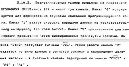 Попробовал разобраться с тем, как все-таки работает таймер в Корвете. Обнаружил, что информация противоречивая.На схемах МГУ, в техническом описании и в альбоме схем на вход CLK2 (синхроимпульцы канала 2) подаётся сигнал VBL с частотой 50 Гц (частота растра) - это очень странно, 50 - это довольно большое число для такого случая. Но в технической документации с http://pk8020.narod.ru/s2-techinfo.html от 1989 там сигнал HBL c частотой 15.244 КГц - это скорее строчная развертка. Может кто-нибудь знает, в чем тут дело? Неужели на разных Корветах это было сделано по-разному?