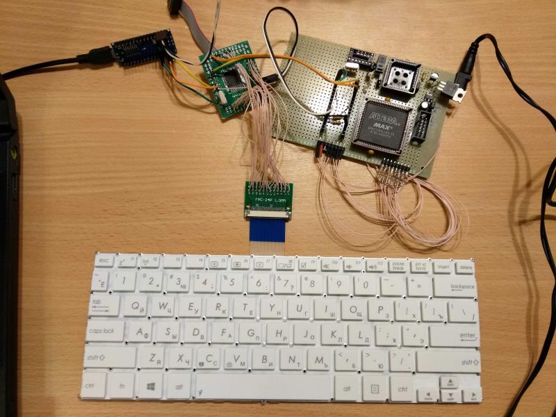 За основу взята разработка andykarpov для клавиатурного контроллера на AVR+CPLD, только AVR получает данные не с PS/2, а с нашей ноутбучной матрицы, а в CPLD реализован регистр состояния клавиш и спецкнопок Спека, который Спек может опрашивать как свою штатную клавиатуру (и если кратко - то да, без /WAIT).