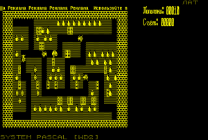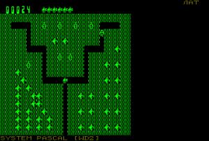 Навёрстывая упущенное поиграл в "ЗЕМЛЕГРЫЗА" из поставки от СЭМЗ для УК-НЦ и дошёл таки до вишенки ;-) Самый низ картинки уровня слегка съедается, но процессу игры не мешает, на 9-й скорости вполне реально играть... В игре 3 жизни на старте. Счёт капает только за врагов, алмазы собирать для прохождения уровней.
