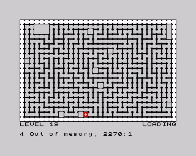 Зациклив генерацию (пропуская прохождение), приблизительно на 12 круге (при максимальном размере лабиринта 21x32 символа) вываливается ошибка Out of memory.