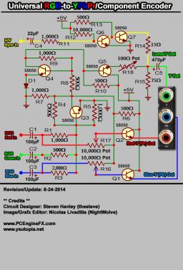 Схема без BRIGHT1, а зачем? Я полностью за YPbPr, но если уж делать, то полноценный аналоговый YPbPr, лучше на ОУ, ещё лучше - специально для этого предназначенных от Analog Devices. Та же LT6550, например.