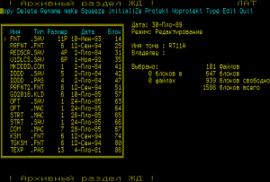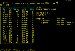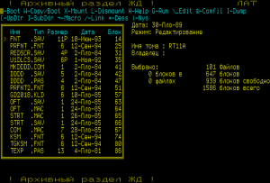 и многое другое, но к сожалению не все сохранилосьКод:'PAS: SET TT ADOS f_m7,14"%f.%e" {P Компилятор } {T Листинг } {R Запуск } {E Редактор текста}* |P: f_p22,0" Tрансляция файла %n" f_p23,0"" Time Run SY:Pascal.sav V:%n.mac,V:%n.LST/s=%f.%e Run SY:MACRO.SAV V:%n.OBJ=V:%n.MAC Run SY:LINK.SAV V:%n.SAV=V:%n.OBJ Time Run V:%n.SAV ...