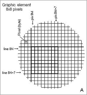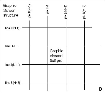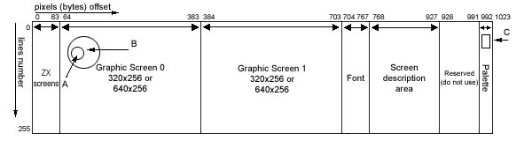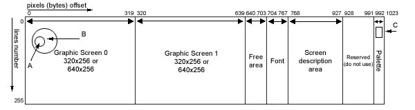 Устройство видеопамяти - 256 строк и в каждой 1024 байта (всего 256 КБ, даже если впаяно 512 используется только половина):