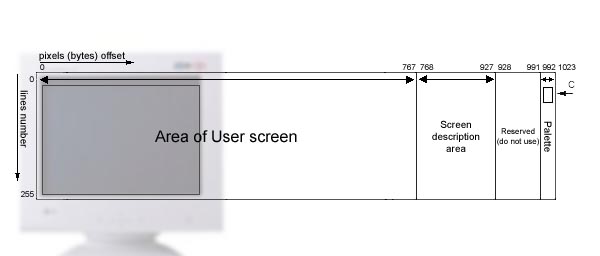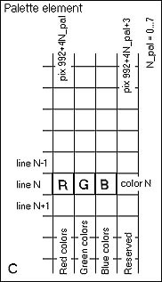 (палитра для нулевой видеостраницы начинается по смещению 992, а для первой видеостраницы - 996, также есть ещё 2 графические палитры - по смещениям 1000 и 1004, но пока их никто не использует).