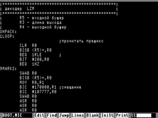 Блин, вот что значит склероз )) Сначала я вспомнил, что Женя написал LZ и мы его активно использовали для сжатия каталогов/дисков. Потом я сжал им картинку TITR1.PIC и получил 15к (восьмеричных). Подумал, что можно поискать исходники LZ и сделать распаковщик для встраивания в программы. А потом оказалось, что Женя сделал этот распаковщик сто лет назад и мы с ним уже применяли его в Color Lines: