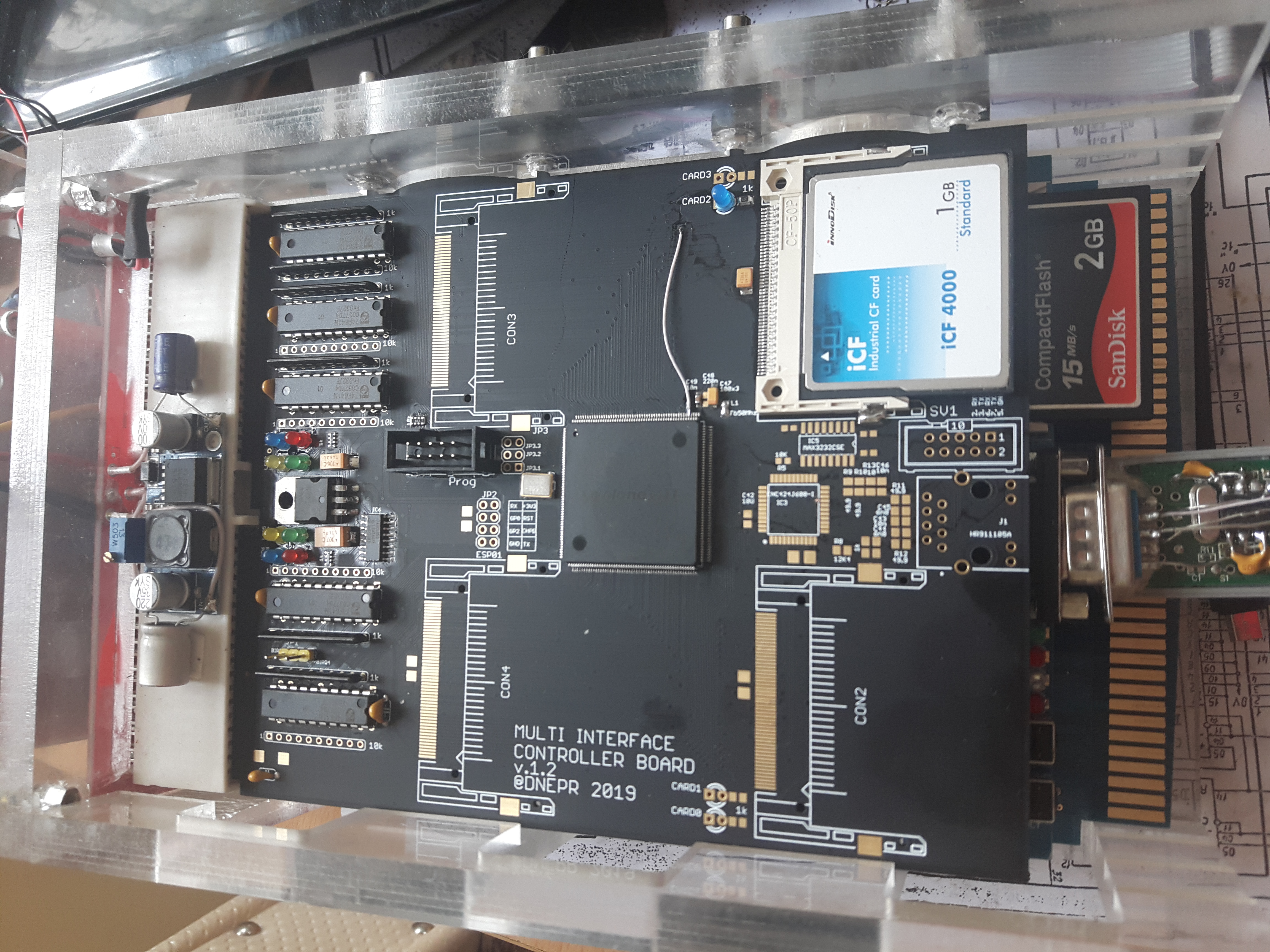Стенд несколько увеличился в размерах Теперь в его основе - корзина от Кванта Плат пока две - с процессором и мультиконтроллером. Над прошивкой мультиконтроллера ещё предстоит работа - пока в нем только прошивка для работы четырёх CF карт (пока без прерываний) и последовательного порта. Надо будет сделать драйвер с поддержкой работы как по так и без прерываний. Ну и настройка на разные адреса регистров и вектора...