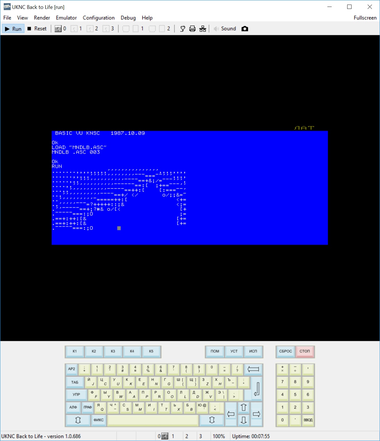 Результаты просто невероятно тормозные. Как такое может быть?! Может кто что-нибудь подскажет, поможет нашим друзьям из Туманного Альбиона? Они там всё ж работают и с УКНЦ... Прикрепляю образ загрузочного диска для УКНЦ. После загрузки выходим из вильнюс-бейсика SYSTEM, затем запускаем RUN BBC и затем LOAD"MNDLB.ASC" и RUN.