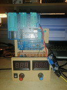 И тут мне понадобилось прошить РТ4 и РТ5... Что бы не делать очередной программатор, решил совместить два проекта, т.е. arduino_eprom27_programmer + "Программатор ППЗУ..." на КН6 https://zx-pk.ru/threads/15617-progr...i-drugikh.html. В итоге получилась плата на двух микросхемах: LS244 (АП5) и DG408 (КН6). Плата вставляется в ZIF-панель программатора. Обязательно внешнее питание порядка 14В, я запитываю от ноутбучного блока питания на 19В через понижающий DC-DC преобразователь на 3А. В схеме нужно подобрать R5 для 5В, а можно использовать, то что указано на схеме и подрегулировать DC-DC преобразователь, но нужно что бы при чтении было порядка 5В (подстройку делать ОБЯЗАТЕЛЬНО при вставленной микросхеме РЕ3 или РТ4). Для нормальной записи должно быть не меньше 12В.