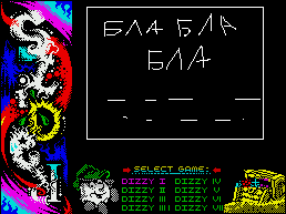 вообще ИМХО меню -- слабое место этого релиза: чтобы понять, что там делать, надо читать текст, а он -- белый на белом, каша... перед тем как попасть в меню -- надо пролистать несколько экранов, это не страшно, если посмотрел на релиз и забыл, а вот если играешь в диззей, то на второй-третьей загрузке уже начинает задалбывать. ну и выбор части нажатием несколько раз на нолик ИМХО неудобно, а вот dizzy-style меню с управлением курсором/кемпстоном/qa было б в самый раз
