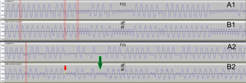 Небольшой опыт практического использования на особо "убитых" кассетах показал, что неплохо бы иметь опциональный "дифференциатор" (см. приложенное изображение). A1 и A2 это исходные фрагменты записей до обработки. Одна из проблем в них - это "дрейф изолинии", т.е. вроде и "синус", но несимметрично относительно 0 (черный пунктир на A2). В результате парсер таких переходов просто не видит. И если единичные провалы еще можно поправить вручную, то при массовом явлении это становится проблемой. Эксперимент показал, что если просто сформировать сигнал вида out(n)=in(n)-in(n-1) и потом нормализовать его по амплитуде (сигналы B1 и B2 соответственно), качество распознавания переходов и определения длительностей значительно улучшается. Получаемый сдвиг фазы на 1/4 периода не портит соотношений длительностей, поэтому может игнорироваться.