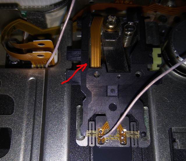 А если вот там, где стрелку намалевал, шлейф уже прикреплен к башке, то зачищать там. Тогда и проводок телепаться не будет.