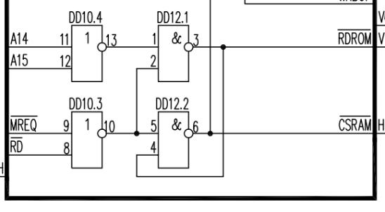 Как я понял, тут, если адрес выше 16К (задействованы А14 и А15) то выдается RDROM и гасится CSRAM, который появляется при запросе MREQ или RD ? так ведь? Подскажите, зачем у Кая D32.4 и D32.2 ? просто как "усилитель" или он дает некоторую задержку?