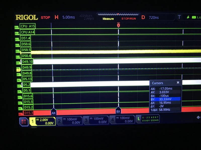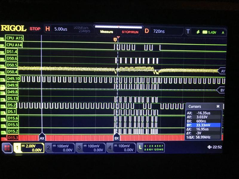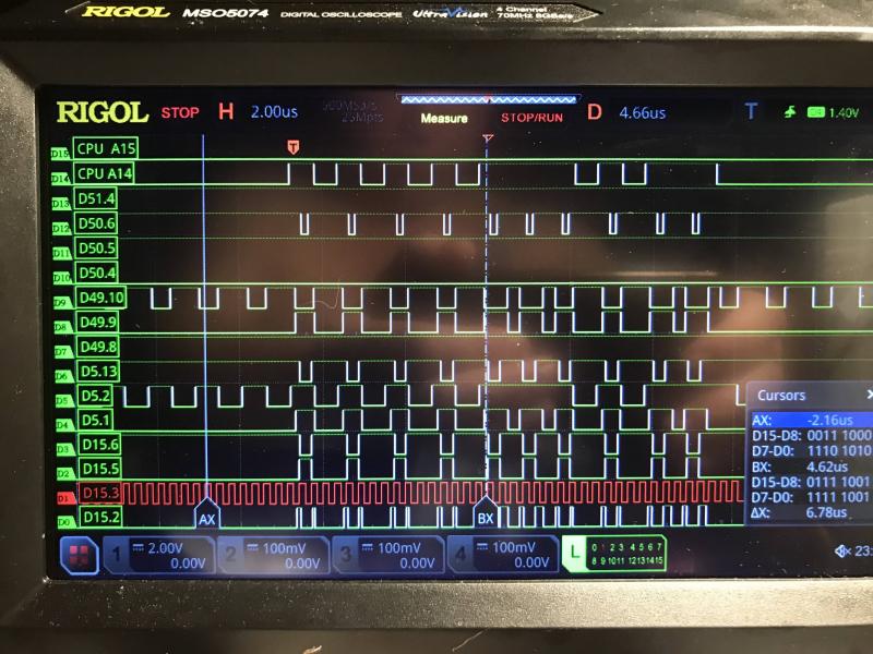 Сегодня приехал логический анализатор для ослика. Времени было не много. Решил сразу тестануть, слева номер микросхемы и номер ножки. Картинки показаны с разным разрешением по горизонтали. Может спецы сразу скажете, что не так? (шутка)