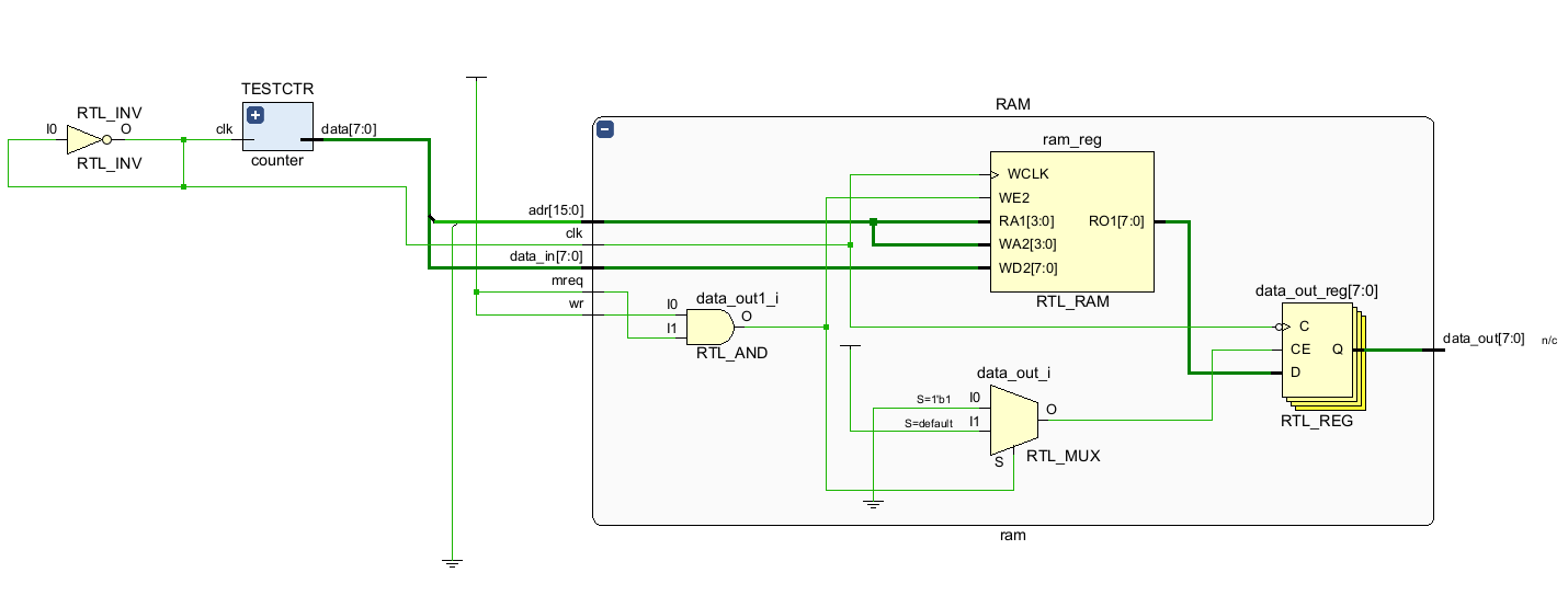 Меня смущает, что RTL_RAM тактируется фронтом на входе WCLK, а сгенерированный регистр RTL_REG тактируется (но спадом). Тогда по логике, память работает по фронту CLK, а выходной регистр по спаду. Но это не соответствует моему коду. Почему так? Если у встроенной памяти есть на выходе защелка, зачем компилятор ставит дополнительную (RTL_REG)? И зачем тут вообще этот RTL_MUX?