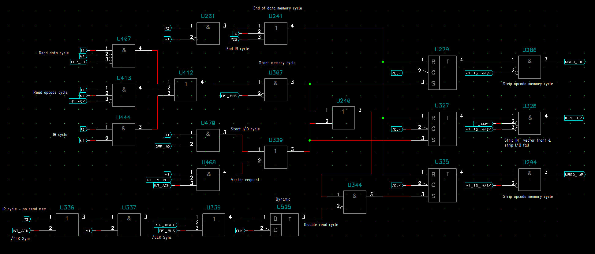 Все дело в том, что это самый кривосинхронный блок в процессоре. Одни циклы длятся 2, другие 3, третьи 4 ПОЛУ-такта, не такта. Да и еще в зависимости от разных условий. Самым оптимальным оказалось добавить на выходные линии простые обрезалки сигналов в нужные фазы. Тут пол-такта отрезаем, сям пол-такта. Тут режем, тут не режем, а тут рыбу заворачивали. Зато вынеся нестандартности за скобки, внутри схемы остался качественный синхронный дизайн.
