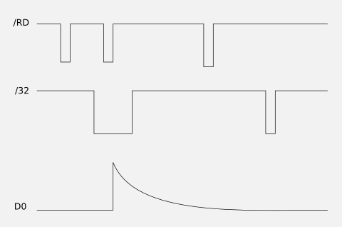 STM-ка слушает два сигнала - /32К и /RD (они инверсные). Пока эти сигналы оба не равны физическому 0, STM-ка держит ноги, которые подключены к ШД Микроши, в режиме Input, чтобы не мешать работе компьютера. STM-ка работает на частоте 72MHz, и в ней сделан быстрый бесконечный цикл без всяких таймеров и прерываний. Как только в нем обнаруживается, что оба сигнала /32 и /RD стали равны физическому 0, STM-ка переключает ноги ШД в режим Output Push-Pull, и выставляет на них байт данных. Как только /32 и /RD оба не равны нулю, ноги возвращаются в Input-состояние.