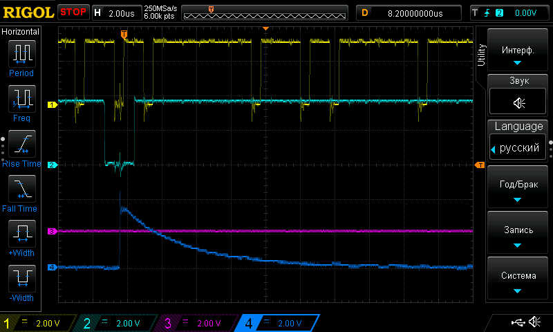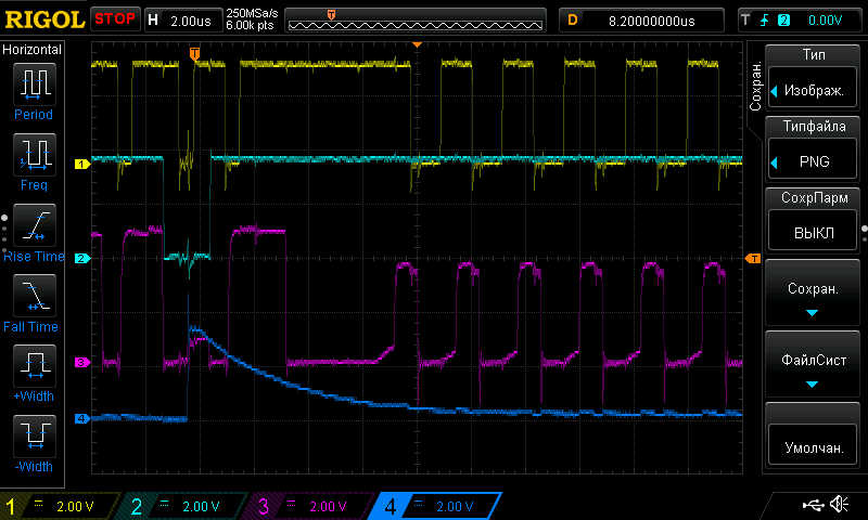 1. Замер произведен на ножке STM, на которой выставляется 1. ШД Микроши отключена, то есть замер именно ножки микроконтроллера STM.