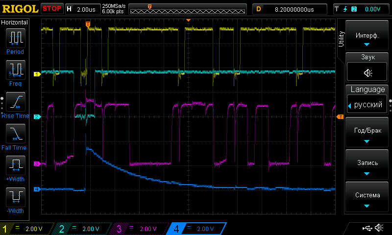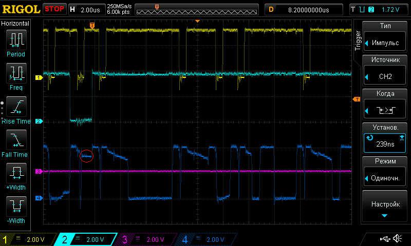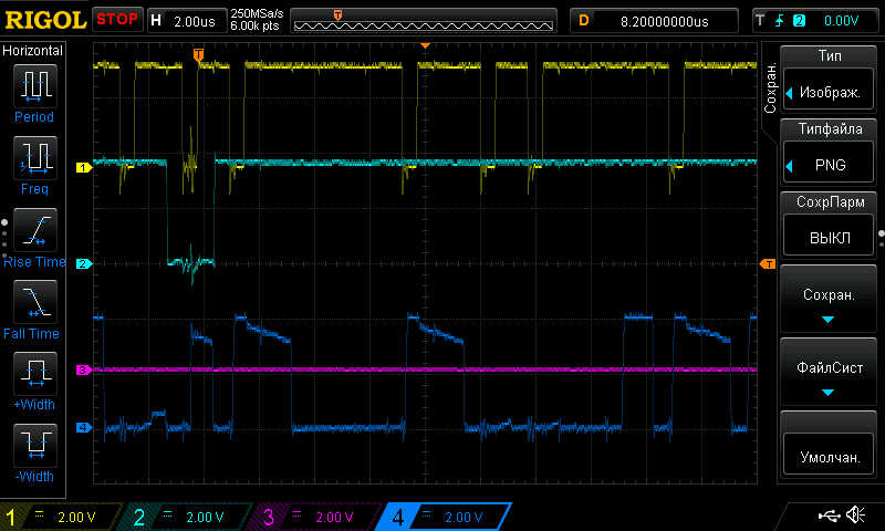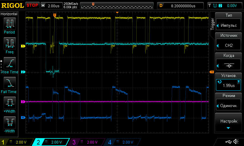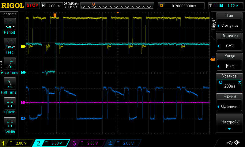 2.А если добавить щуп на ШД Микроши (с STM ШД еще не соединена), и посмотреть что в этот момент происходит на стороне Микроши, то на фиолетовой линии видно, как Микроша в этот момент генерит единичку на D7 (потому что при 82H на D7 единица будет) и 0 на D6: