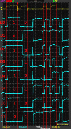 Поскольку 0x55AA видно на экране, то значит CPU стартует и выполняет код из ПЗУ и все мои домыслы о том, что 3Мгц много - неверны. Т.к. там push/pop то удобно зацепиться осциллом на сигнал СТЕК на ВУ - получится неплохой строб для анализа данных на шинах. ША отчетливо показала 0xDCEF+0xDCEE на push и 0xDCEE+0xDCEF на pop, что правильно и соответствует логике работы стека.