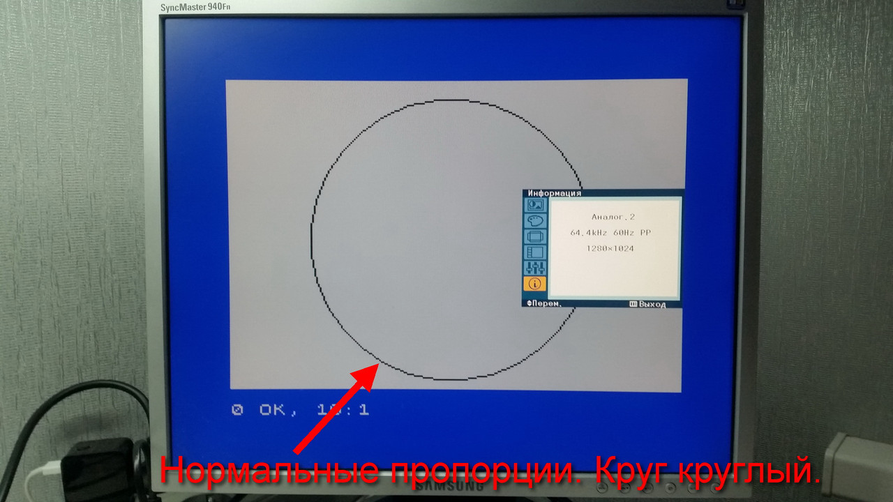 Адаптер выдает на монитор сигнал разрешением 640х480х60 Гц. На мониторах формата 5:4 разрешением 1280х1024 немного искажаются пропорции картинки. Т.е. круг становится сплюснутым с боков.