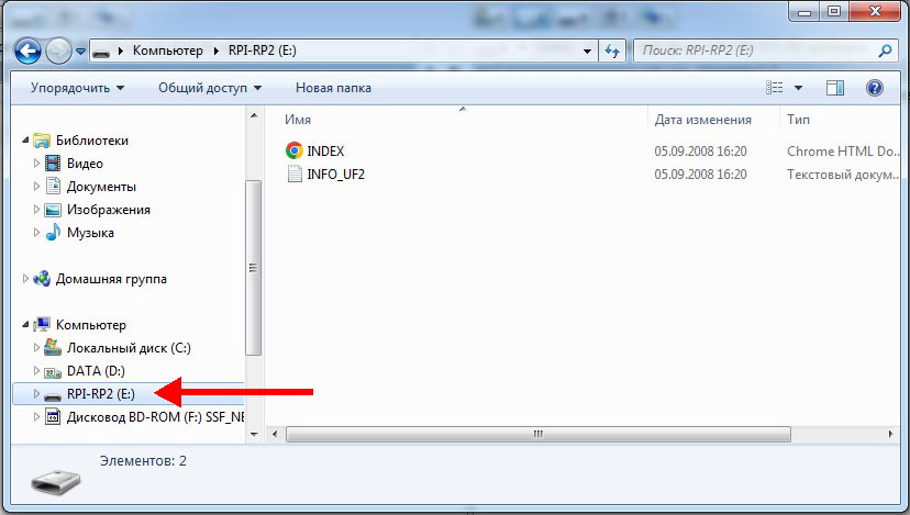 Подключаем собранное устройство к VGA-монитору. Зажимаем на модуле Raspberry Pi Pico кнопку Boot, и, удерживая ее, подключаем USB-кабель к компьютеру. В системе появится новый диск RPI-RP2. После этого кнопку надо отпустить.