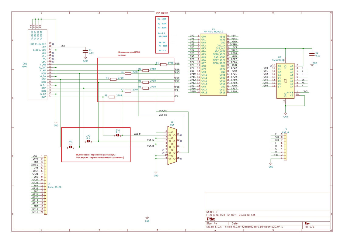 Итак, для сборки адаптера нам нужна печатная плата (герберы есть на гитхабе автора), модуль Raspberry Pi Pico (подойдет зеленый и черный), разъем VGA или HDMI, микросхема-шифтер 74LVC245APW (корпус TSSOP-20 - смотрите не ошибитесь при покупке!), несколько резисторов (типоразмер 0805) с номиналами как в схеме, а так же блокировочные конденсаторы 0.1 мФ (типоразмер 0805). Если нет печатной платы, устройство можно собрать на "макетке" и использовать DIP-элементы.