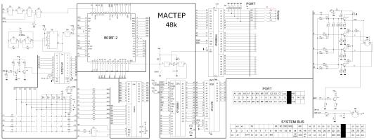 Судя по приведенной схеме в этом "Мастер 48" используется БМК (В02ВГ-2) от "Мастер 128" (имеющая встроенный порт #7FFD). Его выходы управляют в т. ч. выборкой ПЗУ (в "Мастер 128" их две). Возможно, проблема в том, что в вашей версии без сброса В02ВГ-2 не происходит выборка установленной на плату ПЗУ.