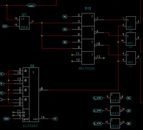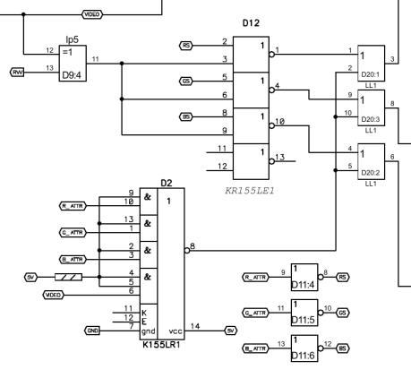 На выход идут не только R,G,B, но и I (интенсивность) - оно собственно нужно лишь для того, чтобы делать серый цвет (I=0 R=1 G=1 B=1) - во всех остальных случаях I=1 (ну кроме чёрного - там I=0 R=0 G=0 B=0). Серый цвет сделан для атрибута 80H Толкалина (чтобы было как в эмуляторе) и для атрибута 8DH Апогея ( это я чисто для себя - не хочу терять восьмую комбинацию : ) а для Акименко серого цвета нет - там 8DH обычный чёрный-по-чёрному.