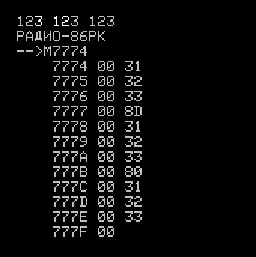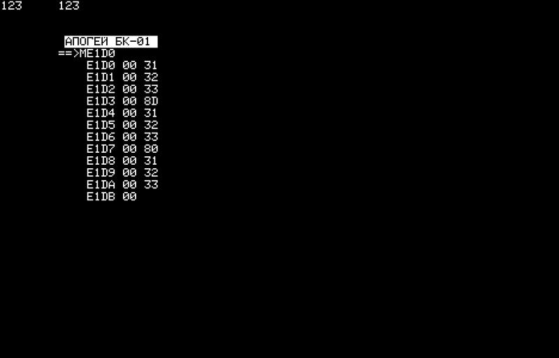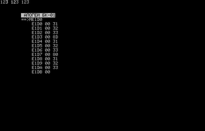 P.S. Кстати вот та же самая проверка 80h vs 8Dh для Апогеев (через эмулятор Emu80) - оригинальный чёрно-белый (без регистра):