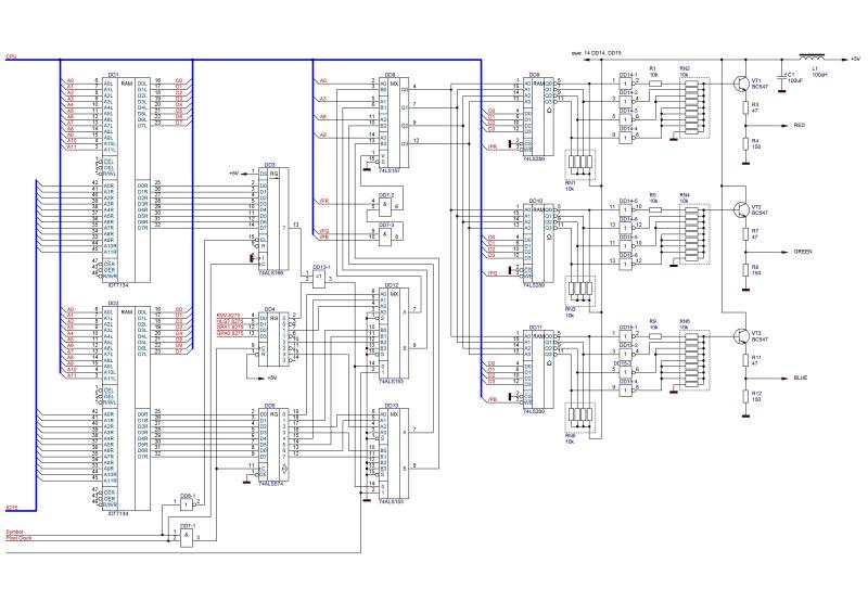 Пояснение схемы: память DD1 хранит графическое изображение символов (знакогенератор), память DD2 хранит индексы цветов для чернил и фона по 4 бита -- итого 16 цветов на чернила и 16 на фон, мультиплексор DD7 переключается между индексами цветов чернил и фона, сами значения цветов хранятся в 4-битном ОЗУ DD9 для красного канала, DD10 для зеленого канала, DD11 для синего канала, итого получается палитра из 4096 цветов, которую можно менять по ходу пьесы, формирование уровней напряжения для цветовых каналов производится ЦАПом на резисторных сборках RN2, RN4, RN6, далее через эмиттерные повторители подаются на монитор. DD14 и DD15 надо использовать КМОП, т.к. у них выход лог. "1" близок по уровню к питающему напряжению, также DD14 и DD15 надо питать отфильтрованным питанием.