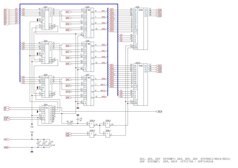 с точки зрения программиста -- только нужно залить память, тут три памяти: память шрифтов (4к) память цветов (4к) и память палитры (три ОЗУ по 16 4-разрядных слов), а вот как они подключаются к процессору -- это уже зависит от реализации. в моей реализации загружаемых шрифтов память не сидит в едином адресном пространстве процессора, т.е. запись в память производится как запись в порты В/В, таким образом требуется всего три адреса, чтобы заполнить память (вся память работает только на запись, чтение не предусмотрено) -- два адреса на выставление адреса памяти и один адрес для данных, при этом, при последовательной записи не требуется каждый раз выставлять новый адрес, адрес инкрементируется автоматически, чем достигается высокая скорость заполнения памяти, даже выше, чем если бы память была подключена непосредственно к процессору. аналогично можно реализовать и запись в память цветов и палитры. для наглядности приведу две моих схемы загружаемых шрифтов, логически они идентичны и взаимозаменяемы, требуют всего три адреса в адресном пространстве.