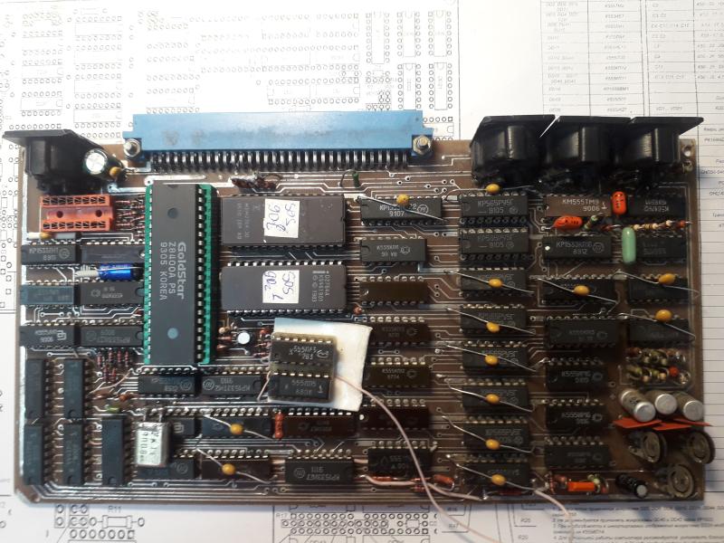 Доброго времени суток. Как окунувшегося в детство, один из сочувствующих моих товарищей попросил меня восстановить , после "золотоискателей" старенький Ленинград 2. Основа, плата одного из первых релизов с дополнительными перемычками на монтаже. Я думал, что впаяю кондеры, восстановлю пару дорожек и будет счастье, но..... как всегда несколько свободных вечеров ушло на поиски оборванных адресных линий, запуска формирователя CSROM. Когда, наконец то, получилось запустить тест, еще и 2 РУ5 заменить пришлось. Вроде бы все, есть заветная надпись, работает клавиатура, и игры грузятся. Но в исходной ПЗУ была залита прошивка с черным основным экраном и белым шрифтом. Для достижения аутентичности взял ПЗУ с оригинальной прошивкой от 1990 года и увидел неприятную картину, на основном экране нет повышенной яркости и на поле видны разводы помех.