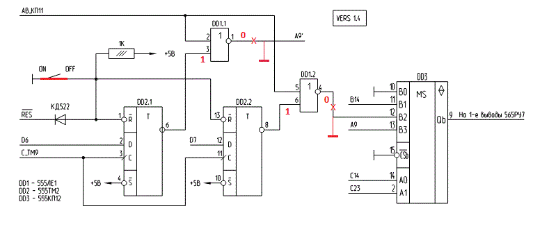 Суть моего вопроса выше, была такова, что правильно ли я понимаю что на доработанном пентагоне с 512к, если переключить тумблер на 128к, то на ТМ2 идёт ноль, из за чего на оба элемента ЛЕ1 идут единицы, следовательно в режиме 128к A9' и на 12н КП12 подаётся ноль... На основе этого, если это так, сделать вывод что для запуска новых озу чипов с задействованной первой ногой но в 128к режиме, хватает только одной КП12 с заземленной 12 ногой и землёй на A9'...