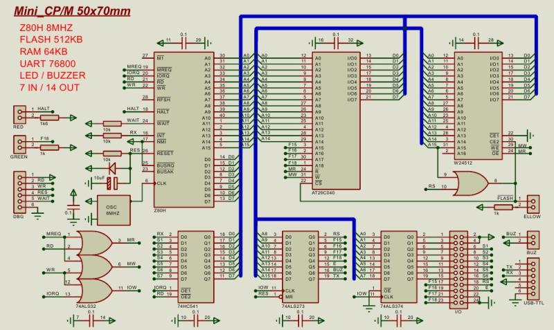 Андрей, а что ты таких монстров лепишь? Давай я тебе нарисую z80/8MHz/256K Flash/64K RAM/13 out/5 in/76800 UART. 7 чипов всего, без МК, минимальных размеров.) CP/M ставится, принтер/программатор подключается. Не?