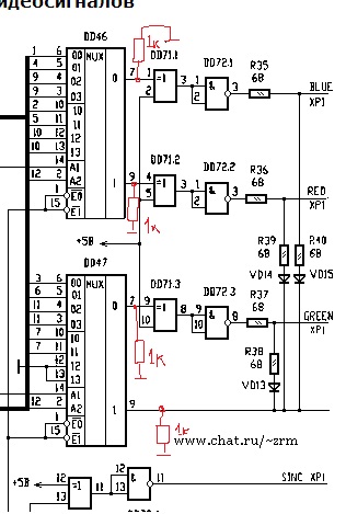 Здравствуйте. Есть пентагон128 91г, так вот в нем есть непонятная для меня доработака, которую я нигде в схемах не встречал. Резисторы напаяны поверх микросхем, что мне очень не нравится. С ними изображение почти нормальное (отсутствует только повышенный уровень яркости), а что без них - видно на фотке. В чем кроется причина?
