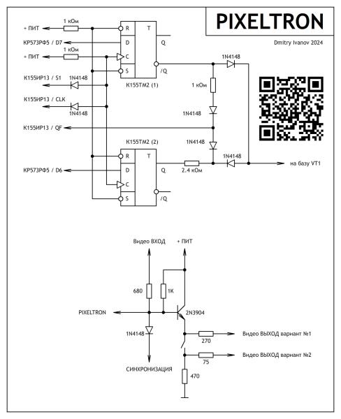 Схема с более точными таймингами. И два варианта видеовыхода, которые точно не глючат на современных телевизорах/мониторах. Нет срывов синхронизации, изменения яркости, повышаются контраст и резкость.