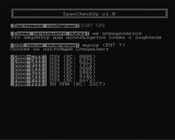 Пока писал эмулятор под Raspberry Pi пытался вникнуть в нюансы работы тех или иных устройств, чтобы сэмулировать всё с максимальной точностью. Для чего даже завёл отдельную тему. И на каждую такую фичу писал небольшой тест, чтобы убедиться, что всё работает так, как задумано. А потом пришла мысль все эти проверки собрать воедино. А когда начал объединять, то получилось, что одни проверки хорошо ложатся на другие. А потом решил результаты не в отладчике смотреть, а выводить текст на экран. Ну и в итоге появилась вот такая программулина - SpecCheckUp. Я её писал-писал, а потом у меня случился отпуск. Думал, что вернусь и допишу (ещё как минимум пару проверок не добавил + есть нереализованные идеи по текущим), но в итоге забросил это дело, так как энтузиазм угас. А сейчас просто решил выложить в том виде, в котором оно сейчас есть. Вдруг, кому-то пригодится. И чём чёрт не шутит, вы предложите какие-то свои идеи для проверок или ещё что-то другое.