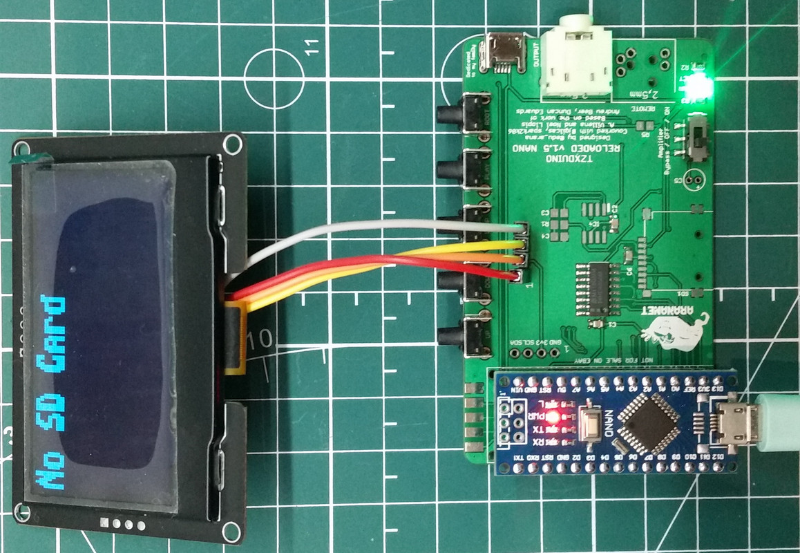 TZXDuino собран на базе модуля Arduino NANO. Кроме самого модуля используется минимальное количество элементов: ОЛЕД-дисплей (128х64 или 128х32), картридер для microSD карты, пять кнопок, две микросхемы, разъем для наушников и несколько резисторов/конденсаторов.