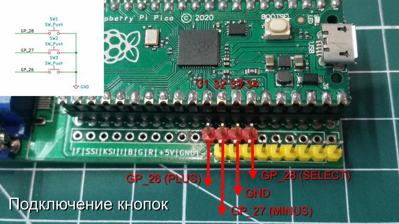 Подключаем собранное устройство к VGA-монитору. Зажимаем на модуле Raspberry Pi Pico кнопку Boot, и, удерживая ее, подключаем USB-кабель к компьютеру. В системе появится новый диск RPI-RP2. После этого кнопку надо отпустить.