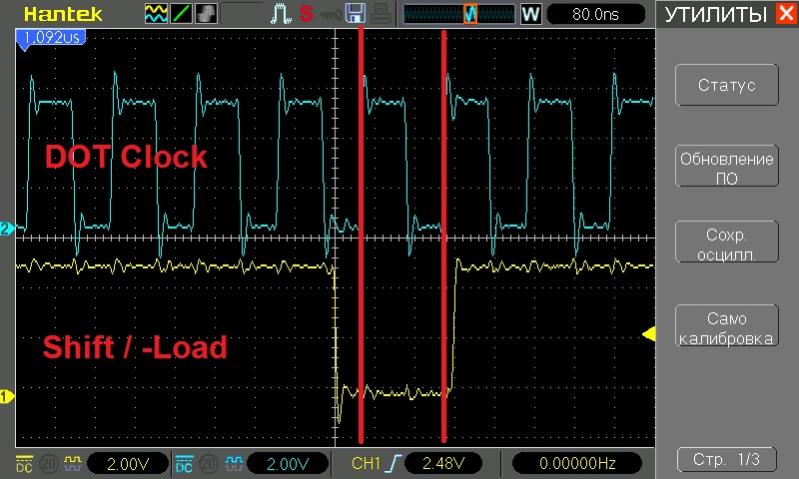 Длительность сигнала Shift/-Load (15 нога U5 74HCT166) составляет 240 нс, при этом захватывается 2 такта Dot Clock.