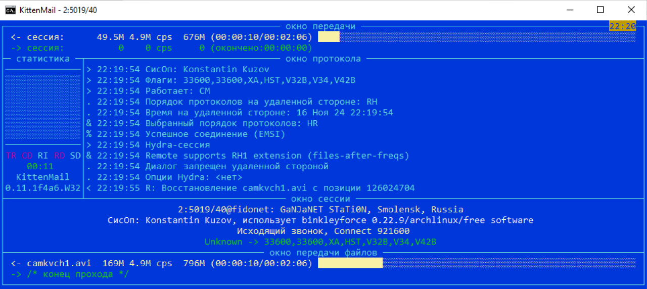 Пример сессии виндового котёнка умеющего лишь в модемы с binkleyforce по ifcico, скорость передачи была в районе 5МБ/с: