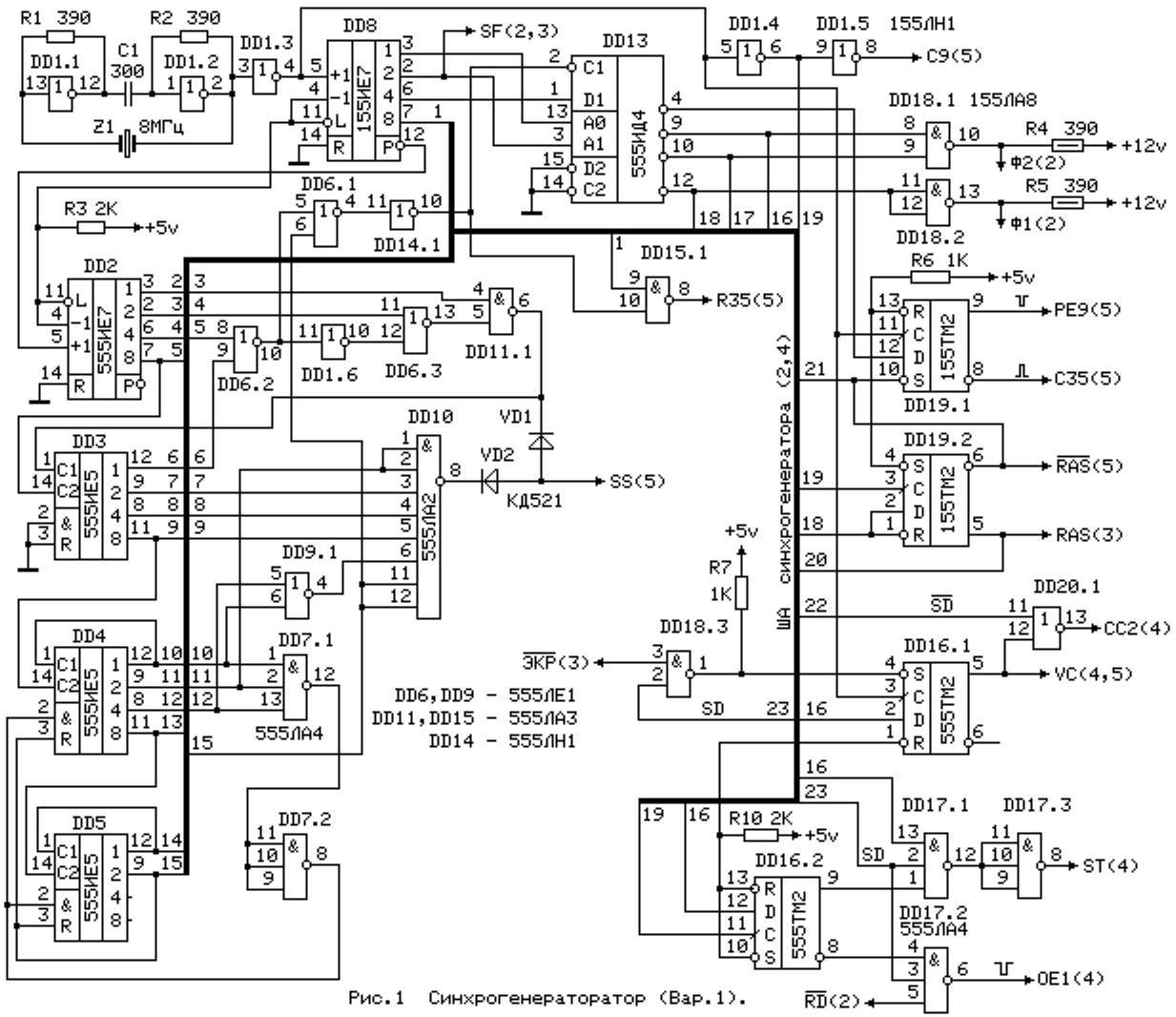 Схемы были подписаны как "Вариант 1" и "Вариант 2". Буду приводить здесь схемы первого варианта. Далее объясню почему. Начнём с синхрогенератора.