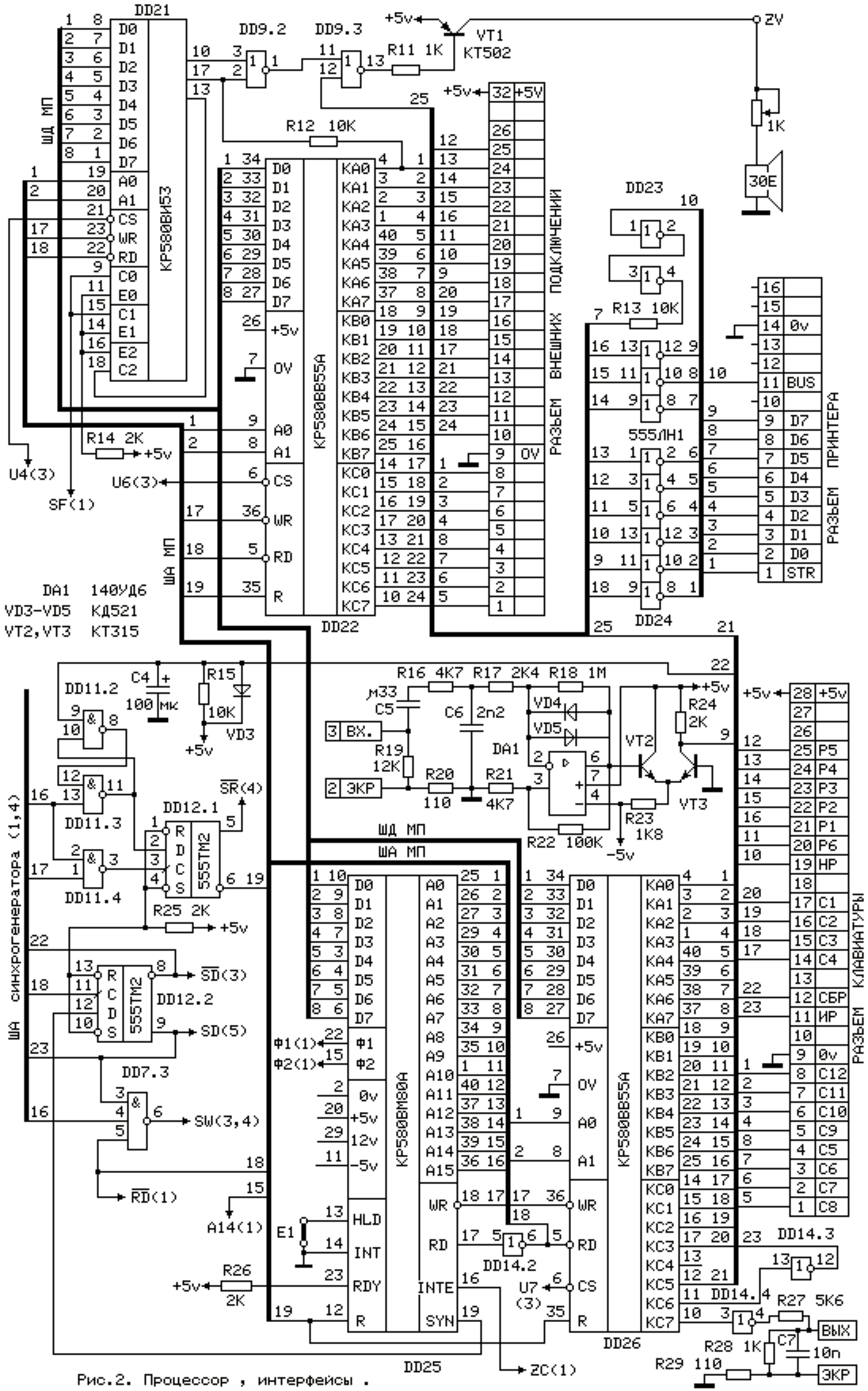 Схема процессора и интерфейсов ничем не отличается от опубликованных автором. Хочу обратить внимание что в схеме чтения/записи с/на магнитофон общий провод, подписанный ЭКР выводится отдельно. Данные обвязки оставим для любителей работы с магнитофоном. Вывод 13 процессора почему-то заземлён, хотя он необходим для работы с контроллером дисковода. А вот сигнал ZC с вывода 16 процессора я не нашёл на первом варианте синхрогенератора. Последнее: Обвязку подключения принтера по Cenronics (DD23 и DD24) не будем повторять, просто выведем все порты на разъём.