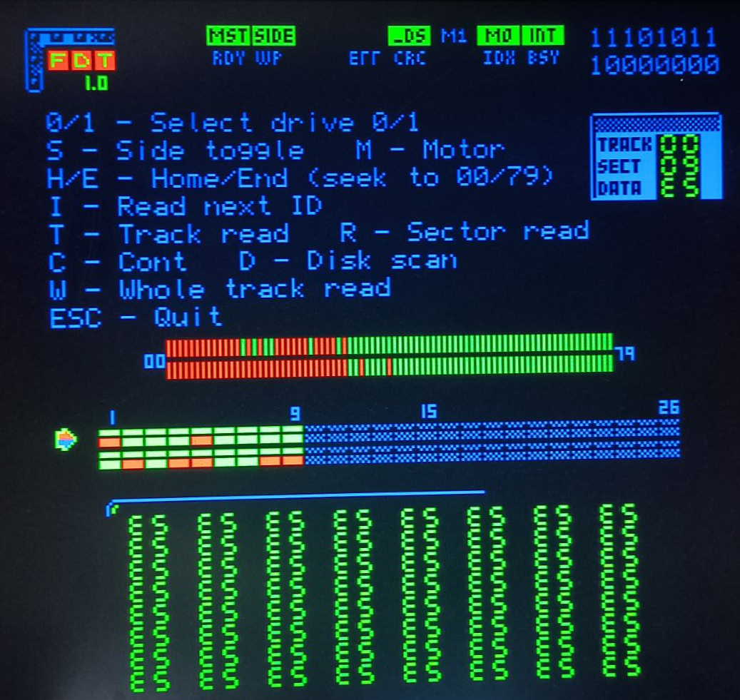 Для удобства наладки-настройки КНГМД и дисководов накидал в первом приближении такую вот тулзу. Позволяет выбирать накопители, перемещать головки туда-сюда, включать-выключать шпиндель, и немножечко читать сектора и дорожки.