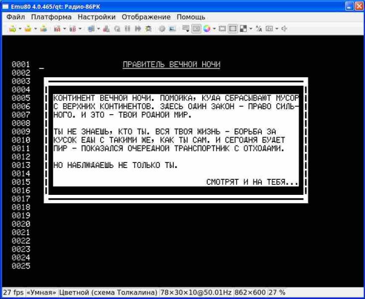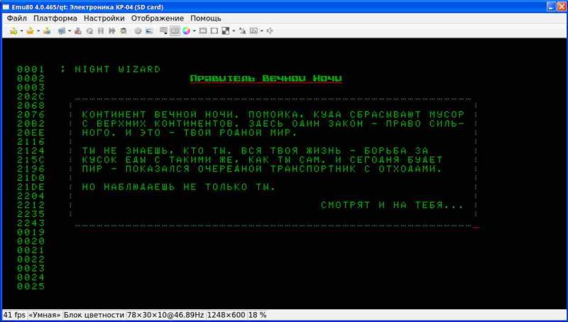 Нда... Теперь я понимаю, почему для РК и вообще советские компьютеры было так мало игр. А текстовых хвестов не было вообще по моему. Даже для того, чтобы сделать такой рисунок в нормальном редакторе мне понадобилось несколько часов. Ну т.е. разработка программы для вывода текста с атрибутами и сам текст... В родном "Микроне" я бы такое точно не потянул. Не настолько я фанатичен ) Вообще, возможно, когда привыкаешь к такому кодингу - оно не так тяжело в моральном плане. Но сейчас... эх.