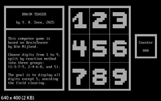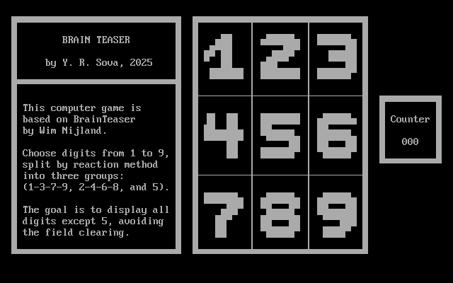 Эта компьютерная игра основана на «BrainTeaser» от Wim Nijland (1993 год, OS/2). Выбирайте доступные цифры от «1» до «9», разделяющиеся по методу реагирования на три группы («1-3-7-9», «2-4-6-8» и «5»). Цель — отобразить все цифры, кроме «5». Только следите, чтобы поле не очистилось и счётчик не переполнился.