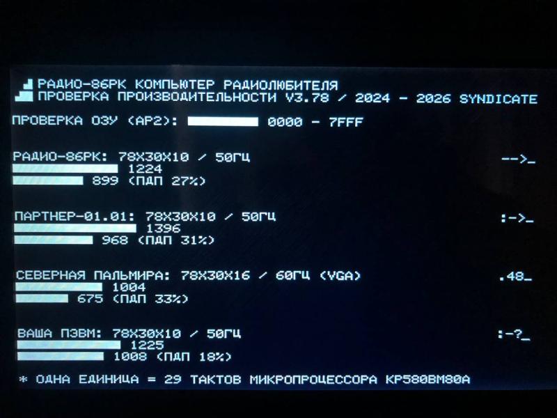 Чтобы понять, что это даёт, я написал тест. В архиве версии и исходники для РК86, Партнёра и Пальмиры.