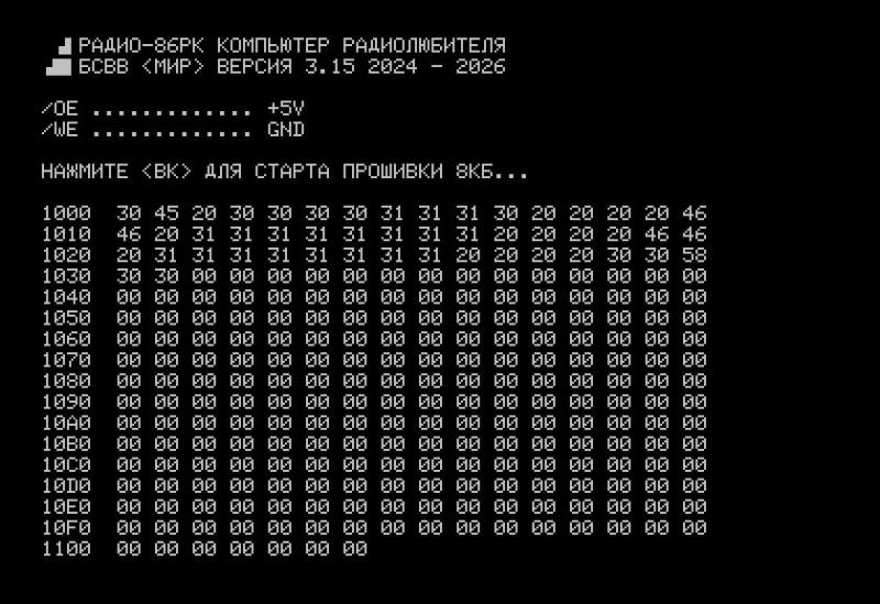 Оказывается к РК легко прикрутить ПЗУ 8кб. В вариантах Киселёва 1.4, SRAM Color и других, дополнительный объём ПЗУ достигается путём припаивания двух линий адреса к панельке ПЗУ, а в Цыгане это уже сделано. Старт машины происходит с адреса E000H. Я решил использовать небольшой кусок этого пирога объёмом 2к для подобия биоса.